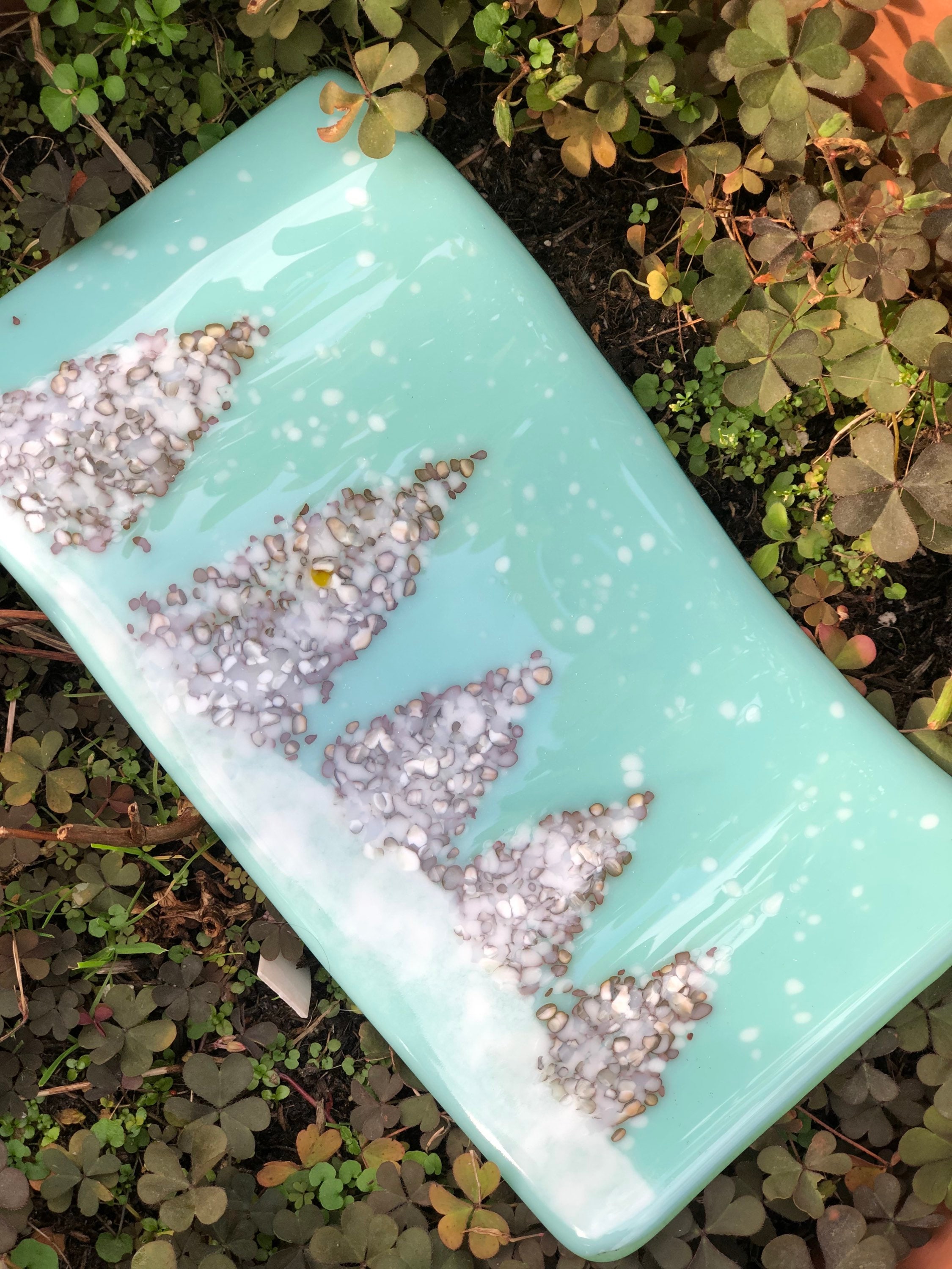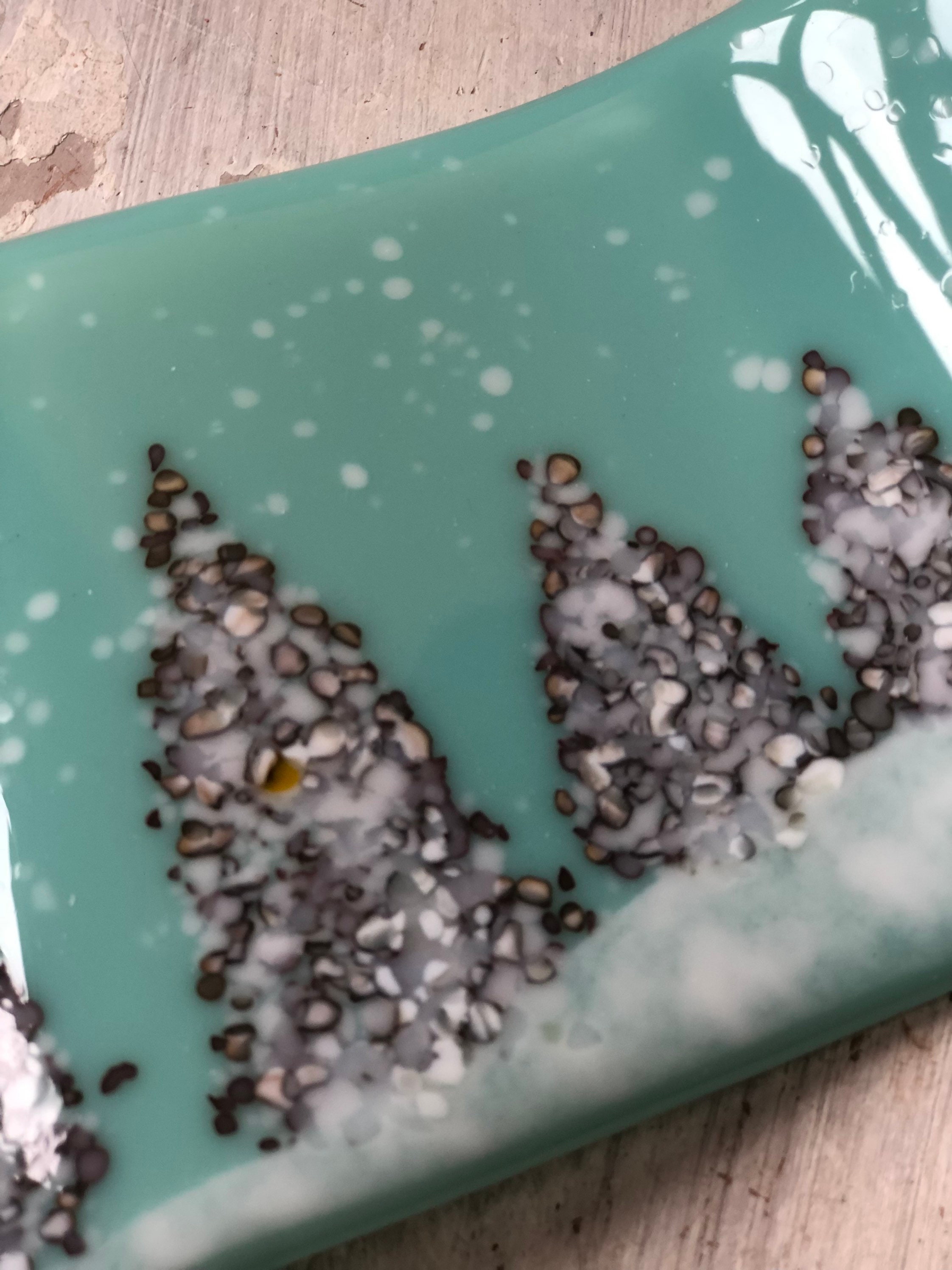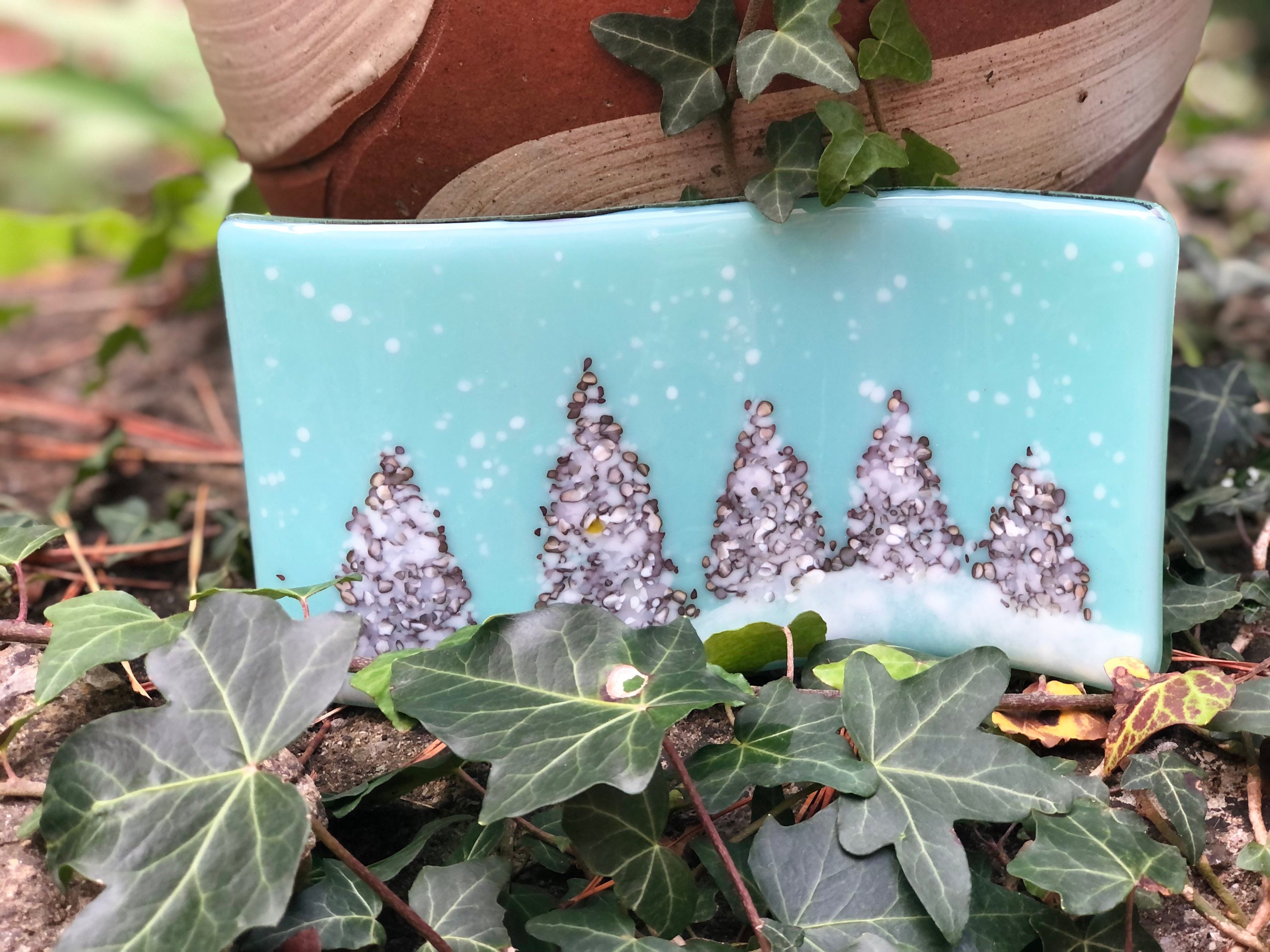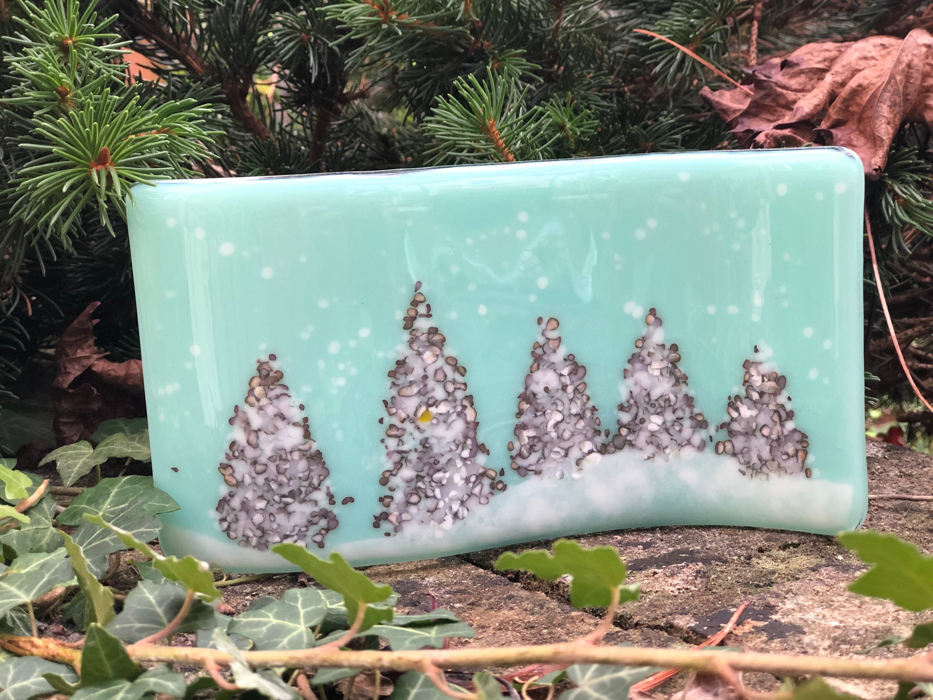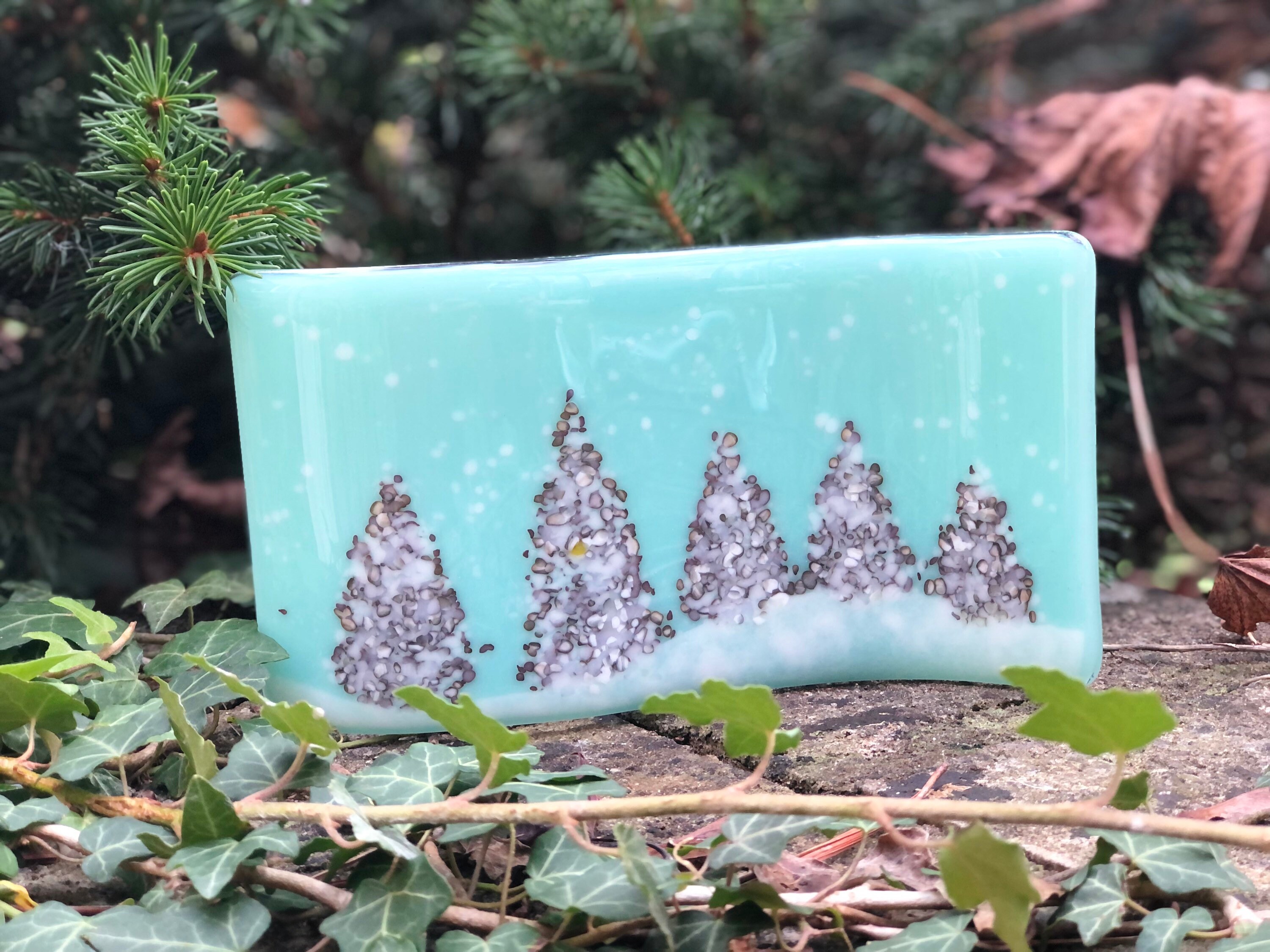 Glass Christmas Tree Winter Panel - this would make a special gift or home decor treat for Christmas. In beautiful "robin's nest" opaque background glass with grey and white mix of crushed glass (frit) for trees and a snowy foreground and specs of white snow.