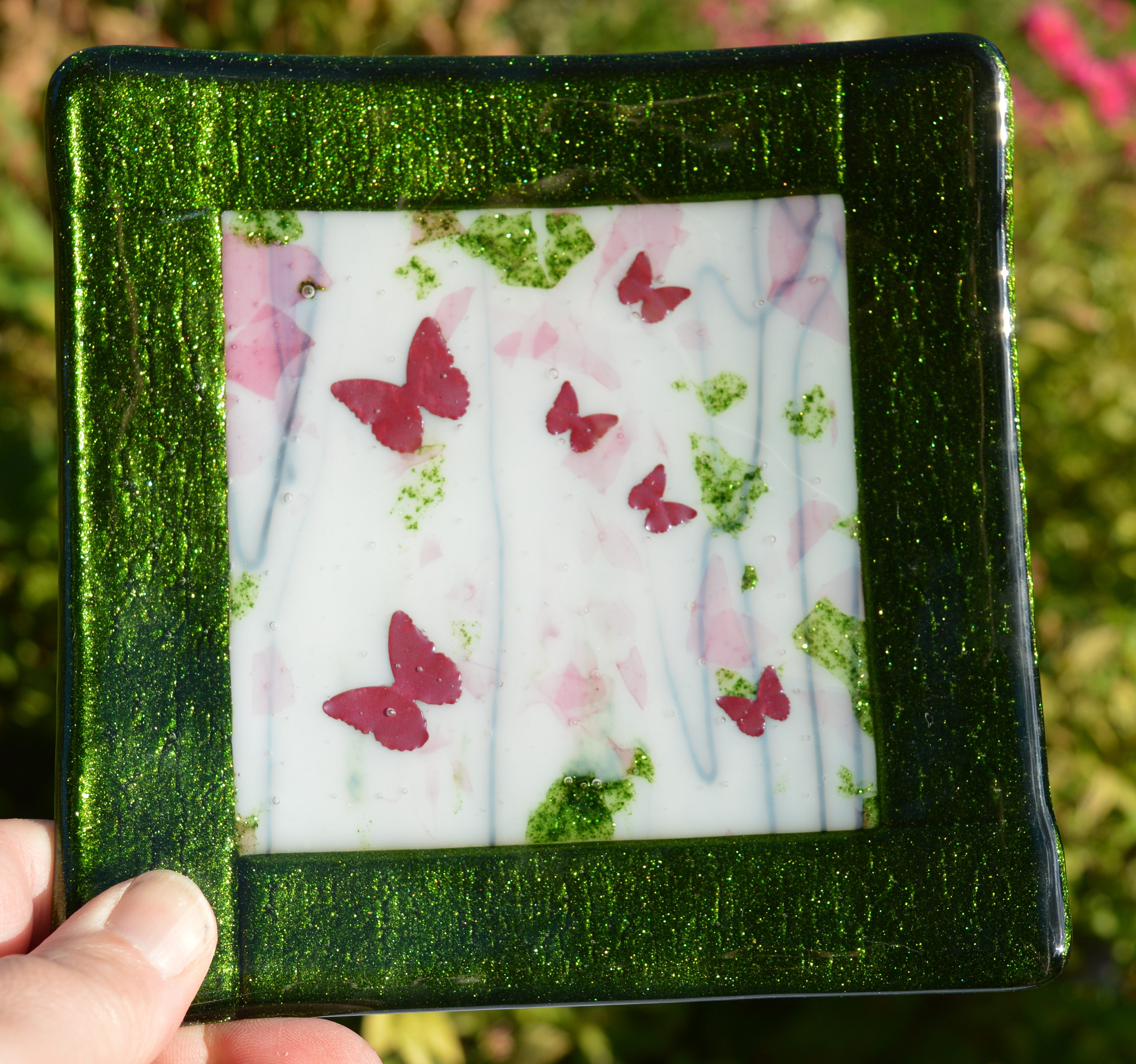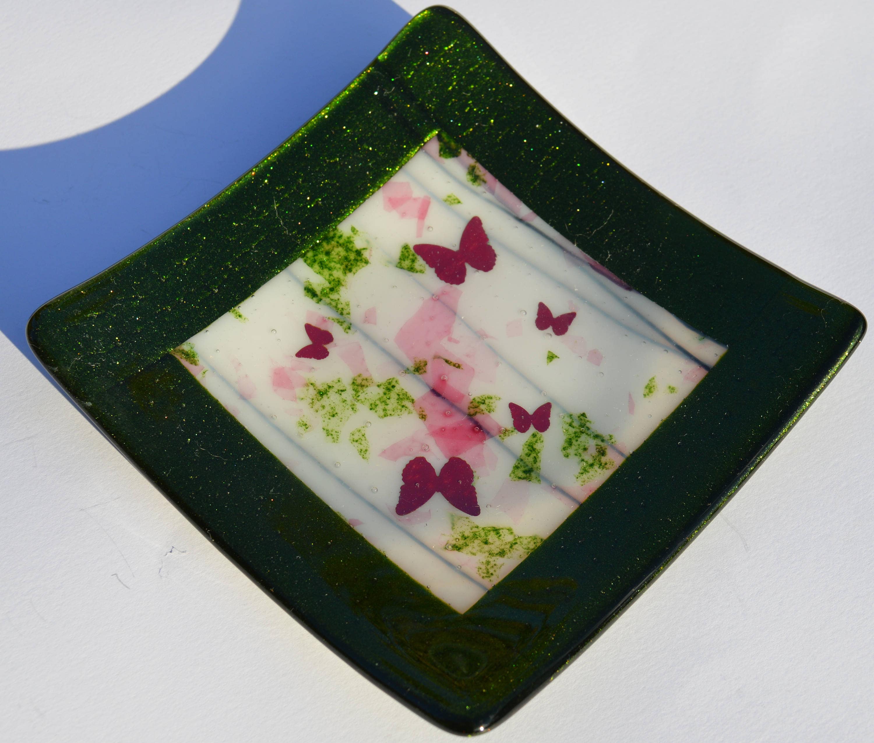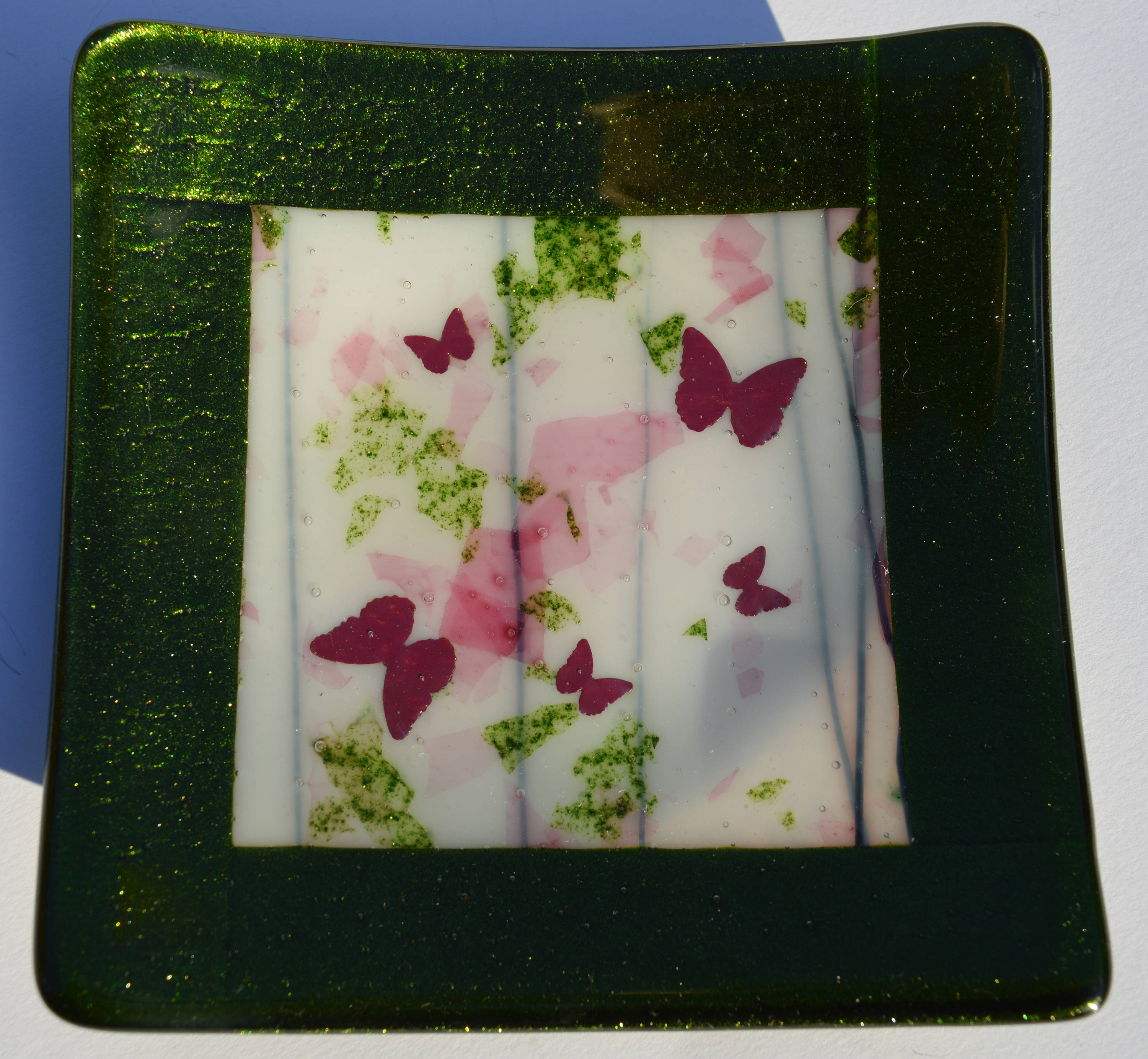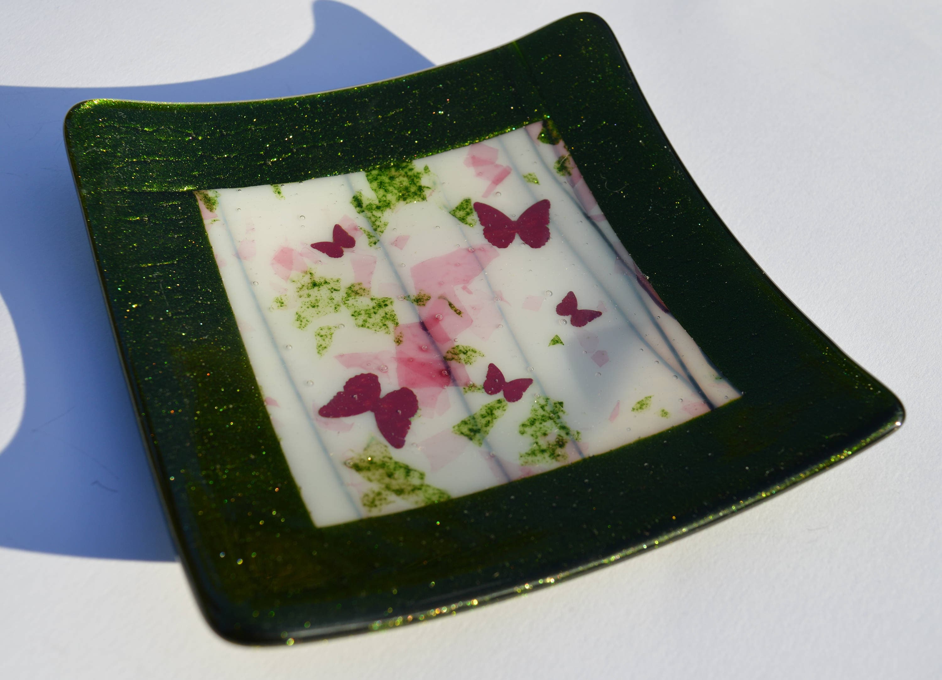Beautiful square glass candy bowl/trinket dish measuring 15cm square. The centre of this bowl is made from a delicate translucent white glass with black squiggles and little fractures of pink and sparkly green glass which resembles a summery garden scene. The border of the dish is a sparkly green colour and six little copper butterflies have been fused under a clear glass cap.