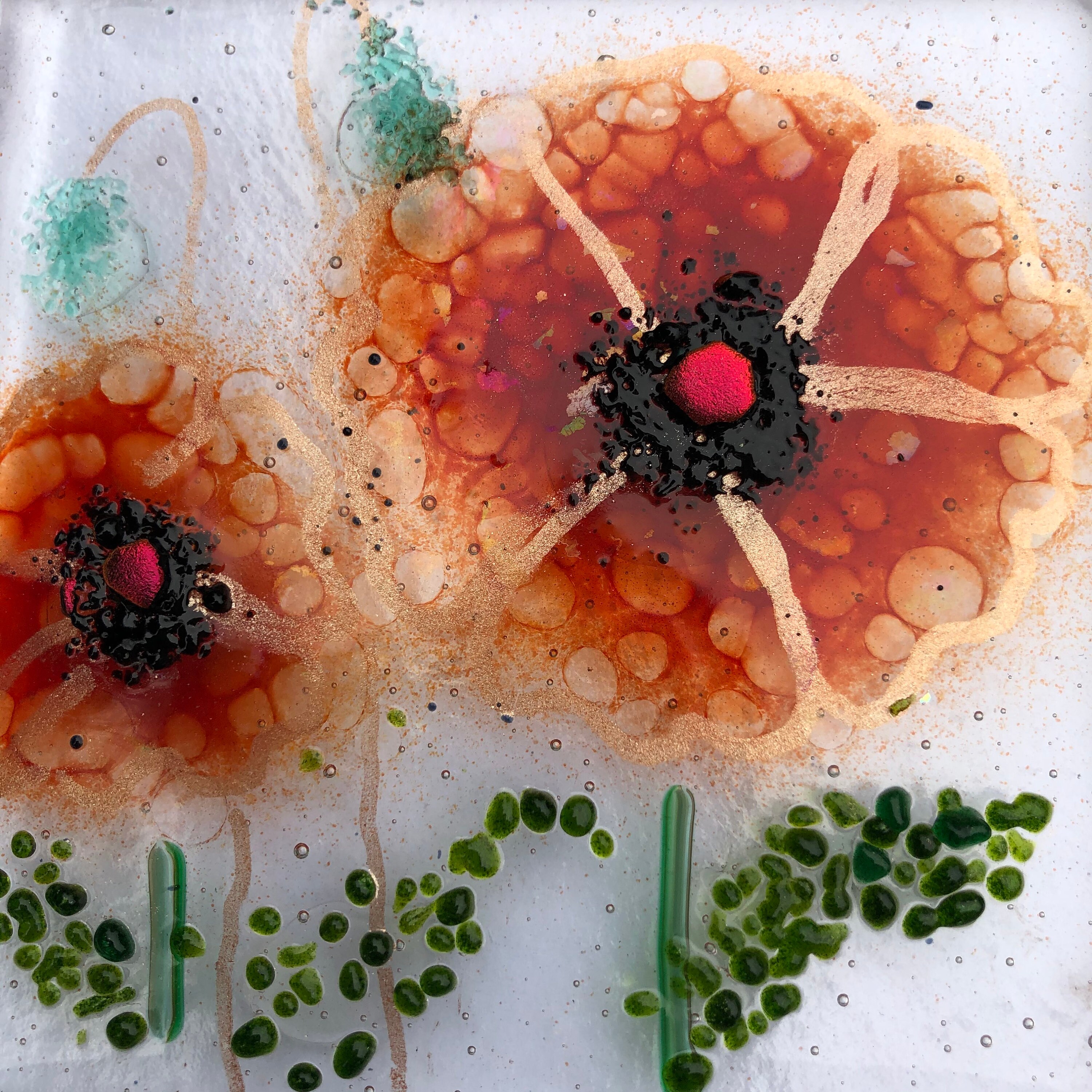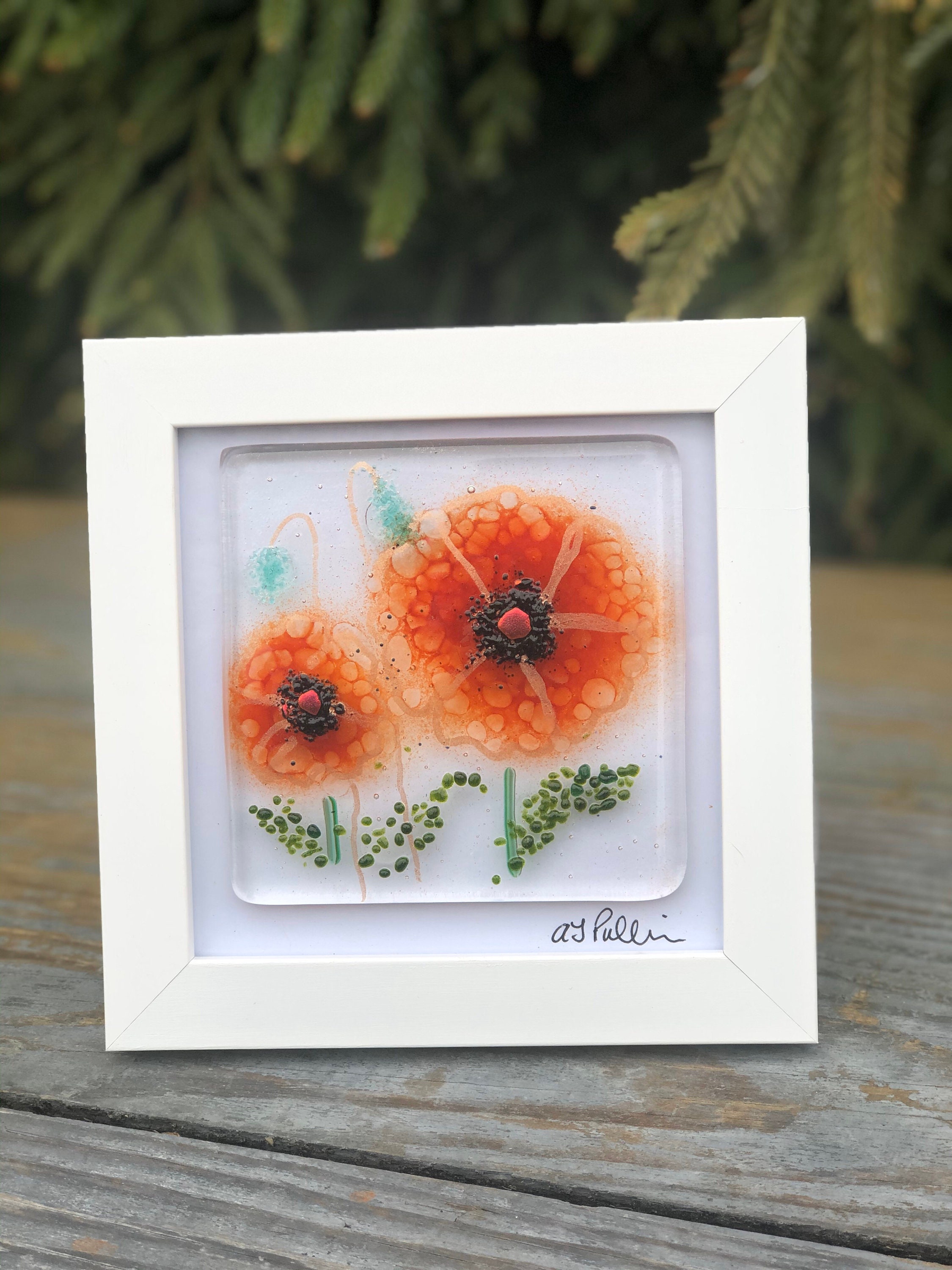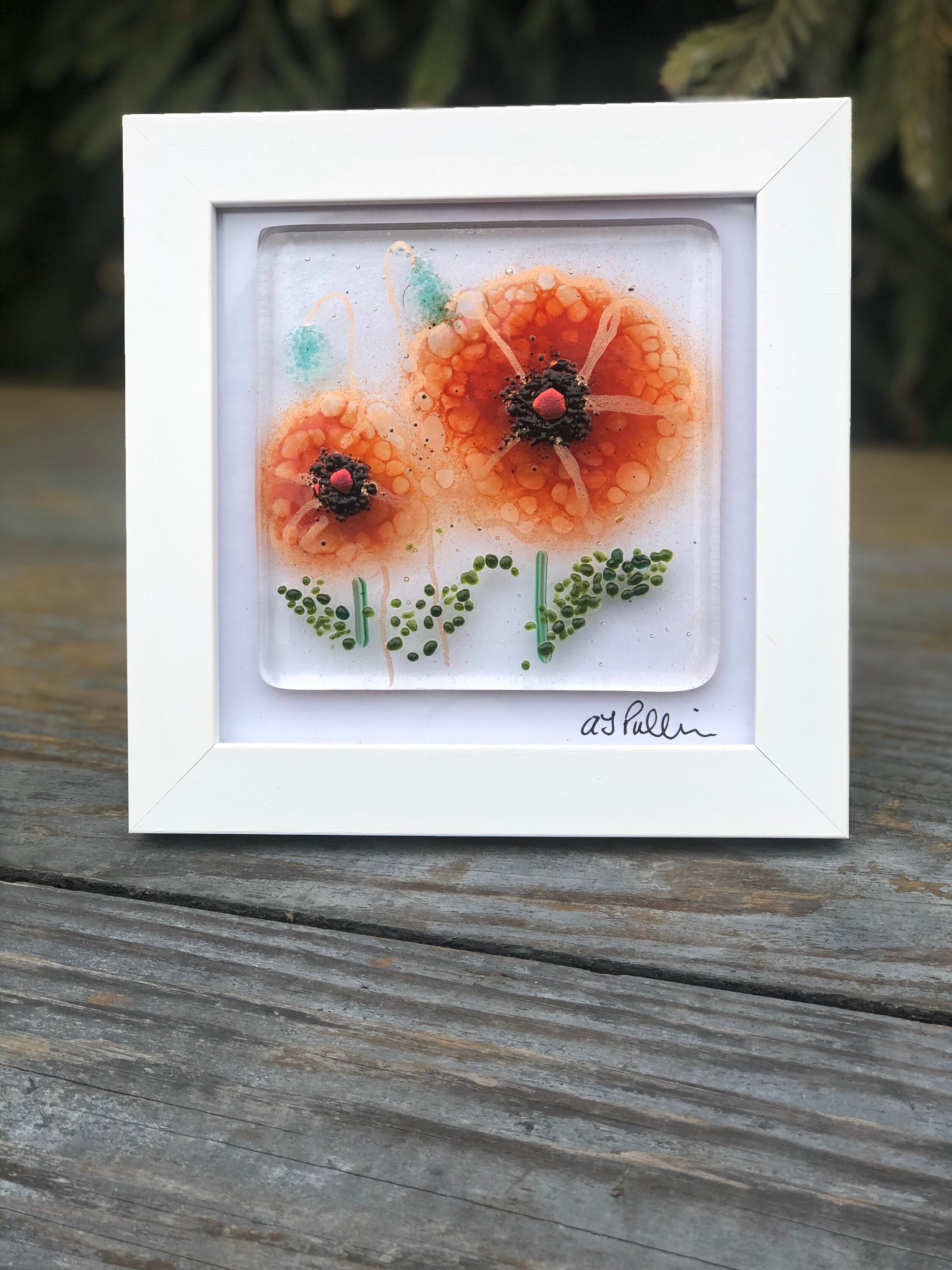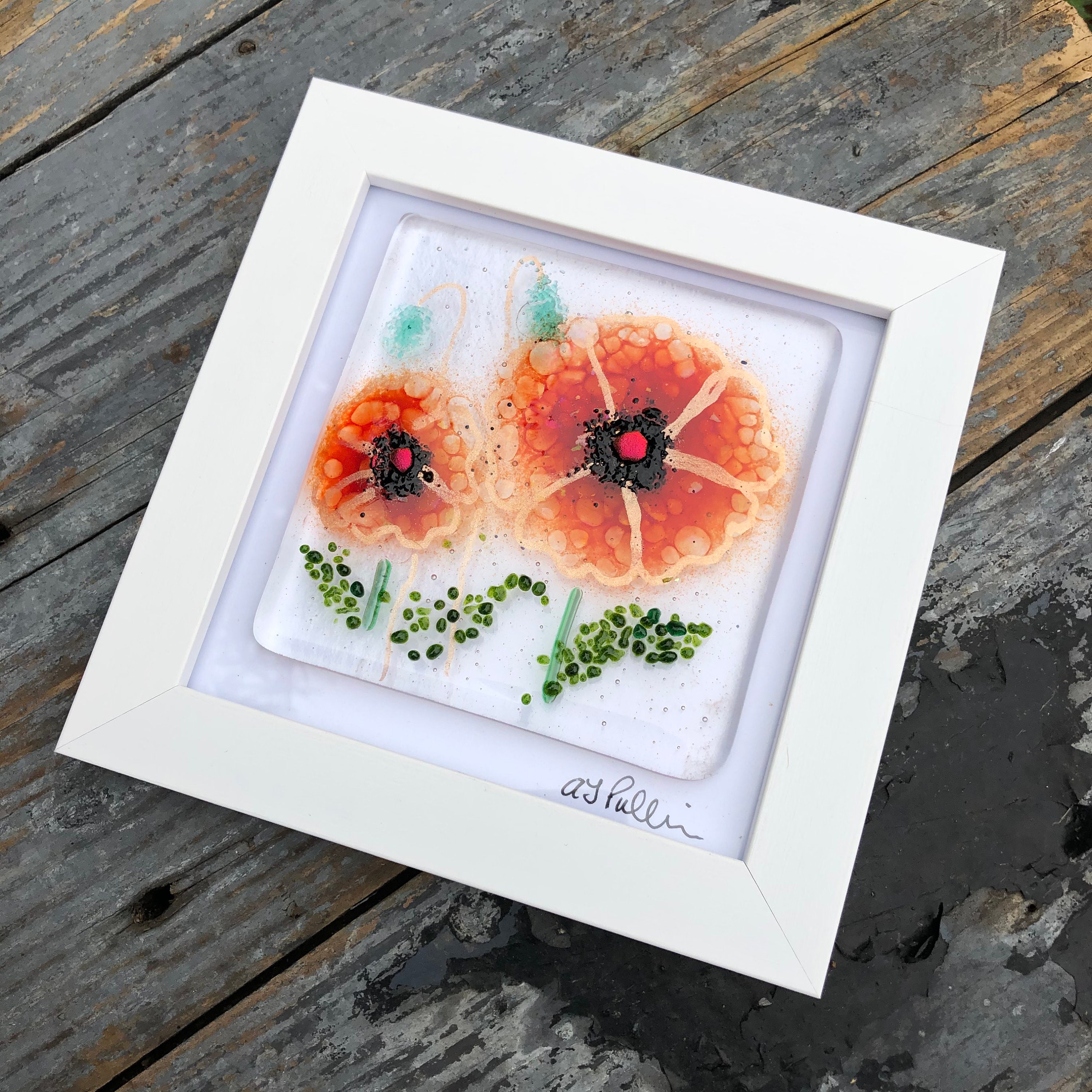 Unique hand made fused glass picture in white frame. Glass picture measures 10cm square and depicts two very striking red poppies with metallic copper accents.