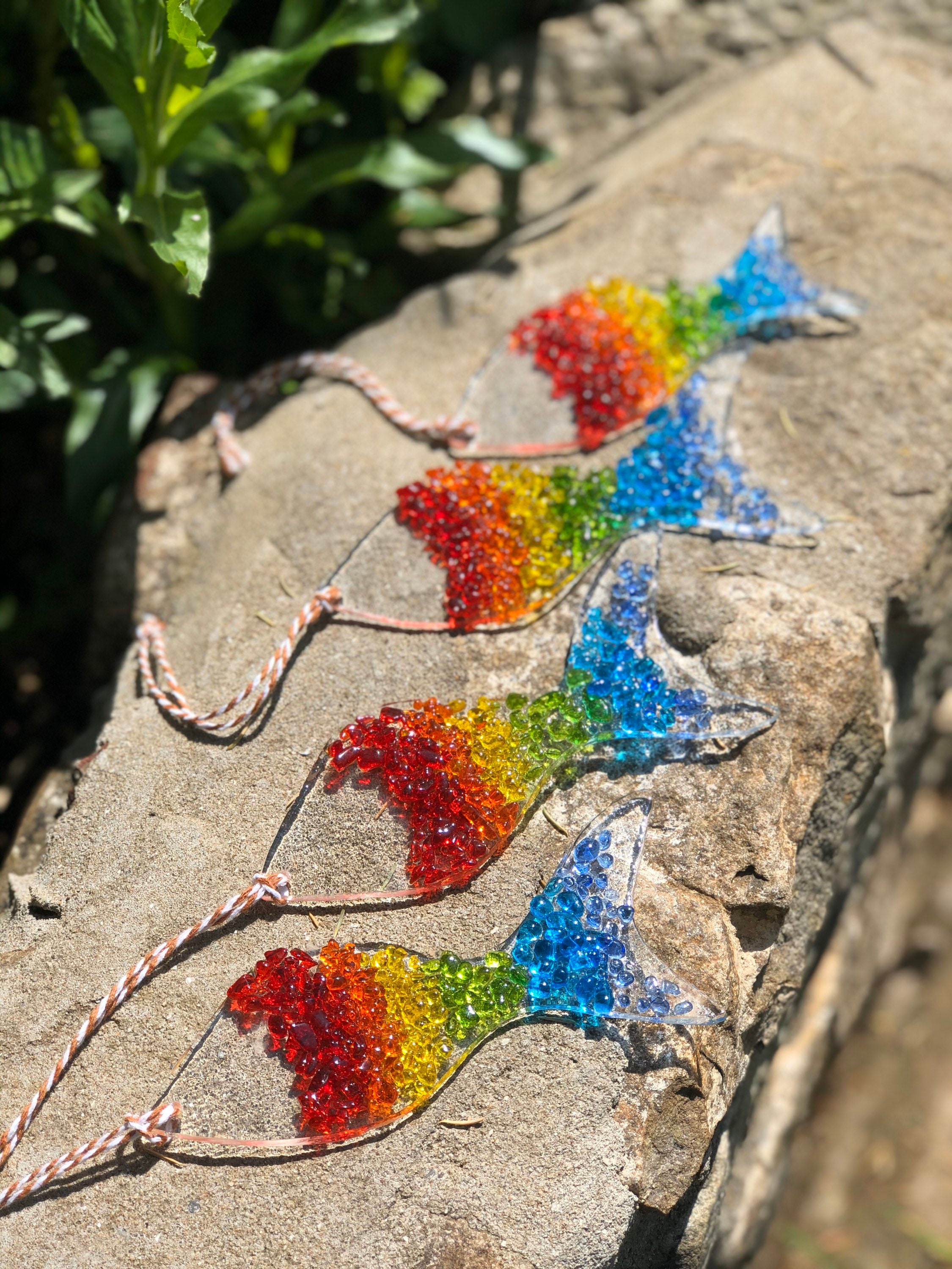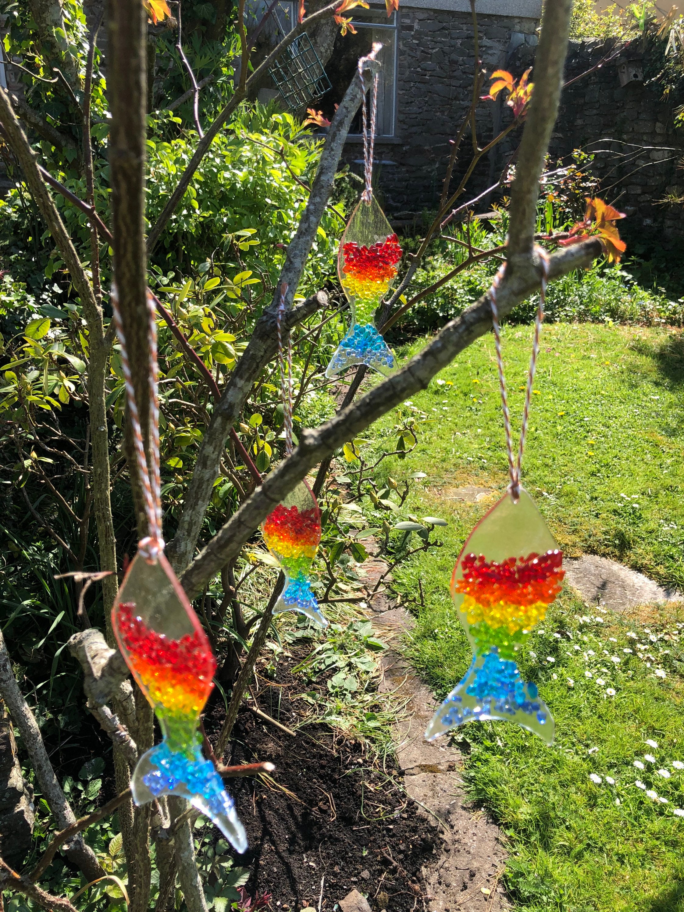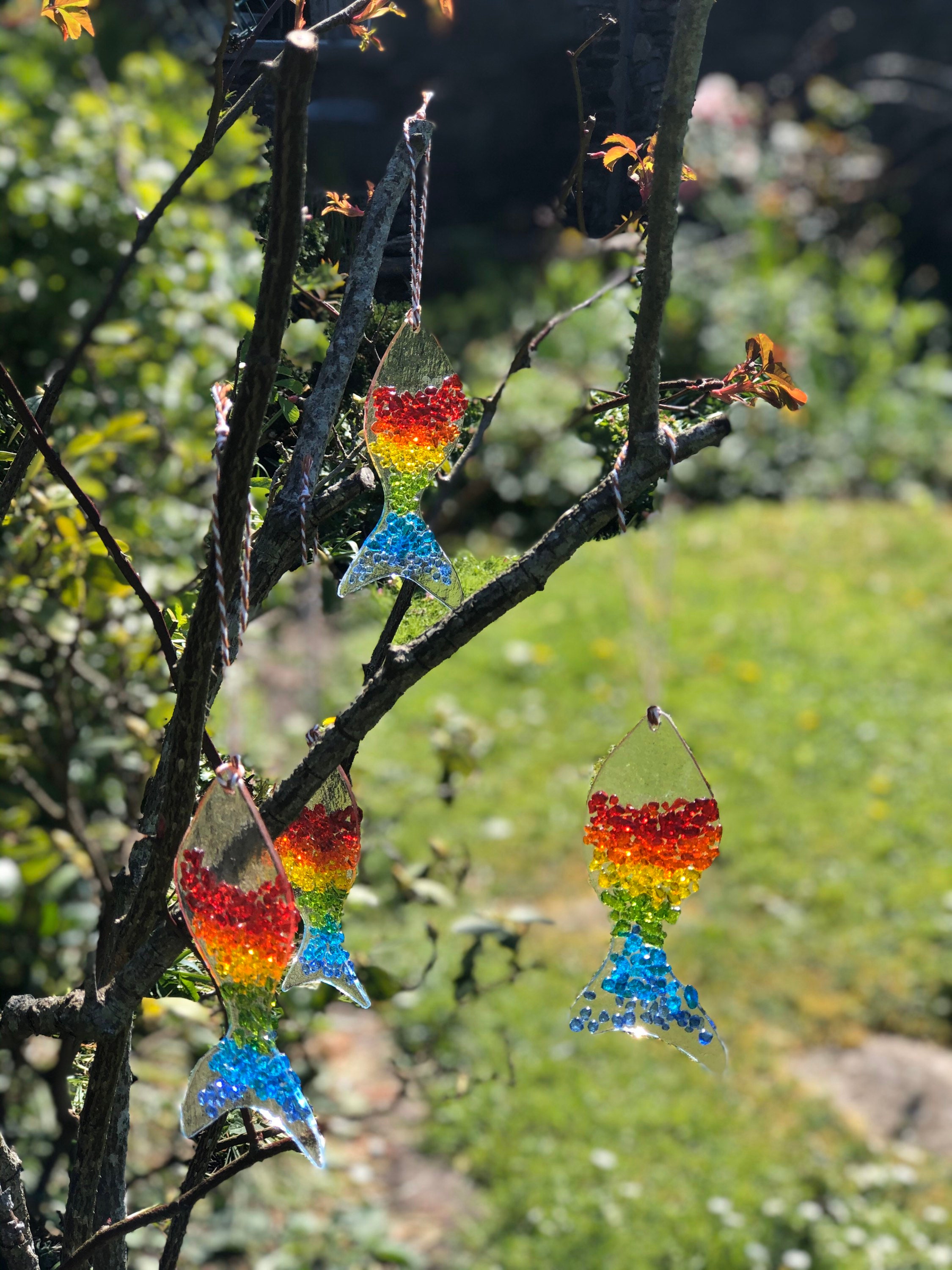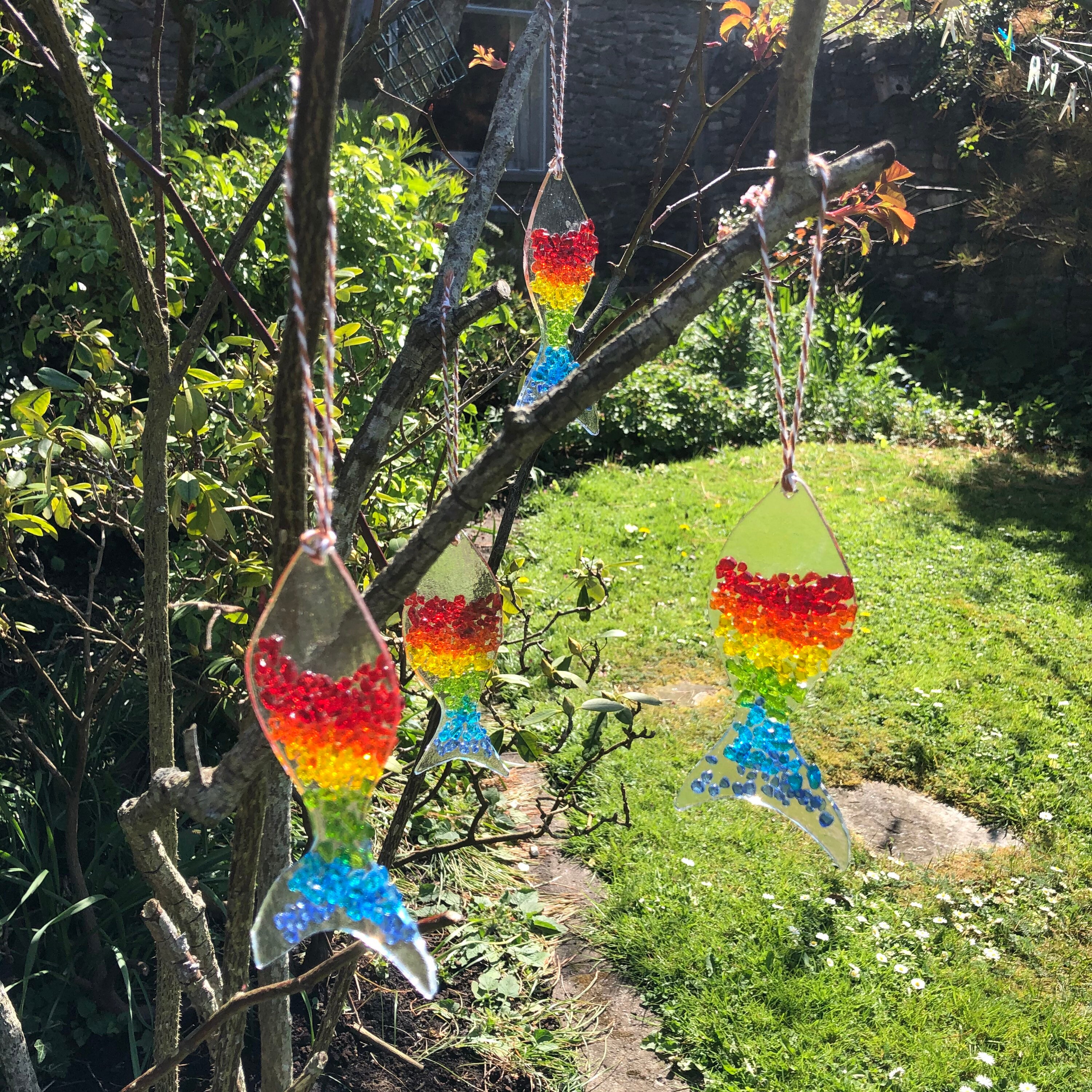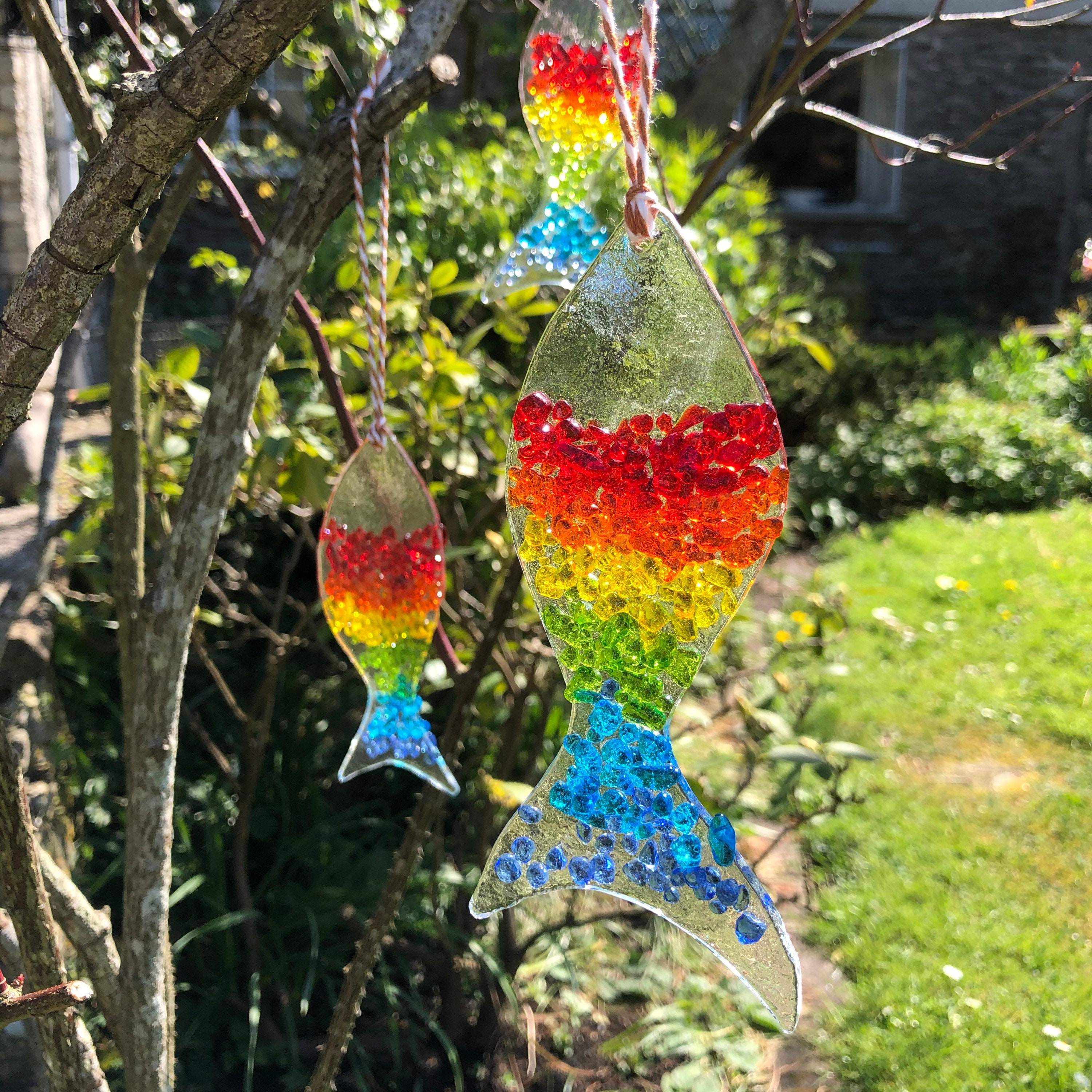 Fused glass rainbow fish sun catcher or wall hanging measuring approx. 14 x 6cm. All a bit different as handmade.